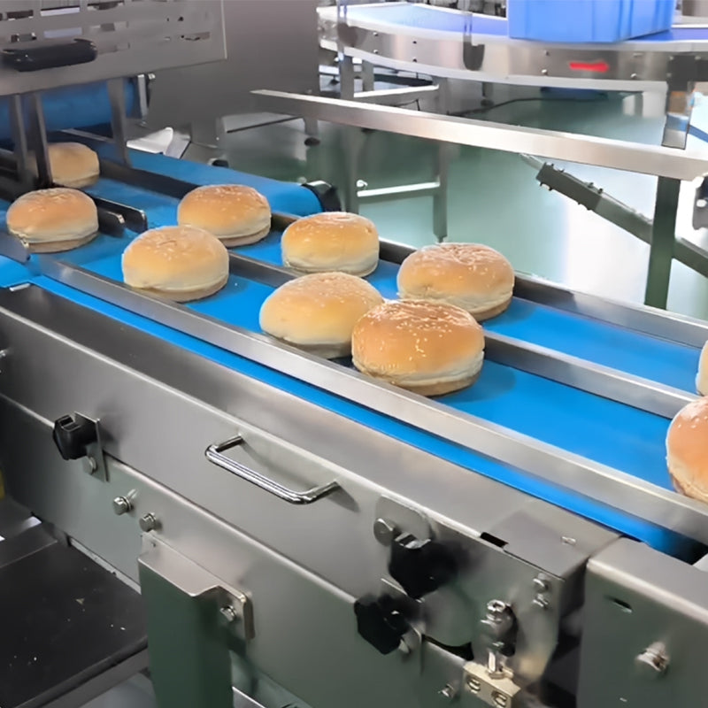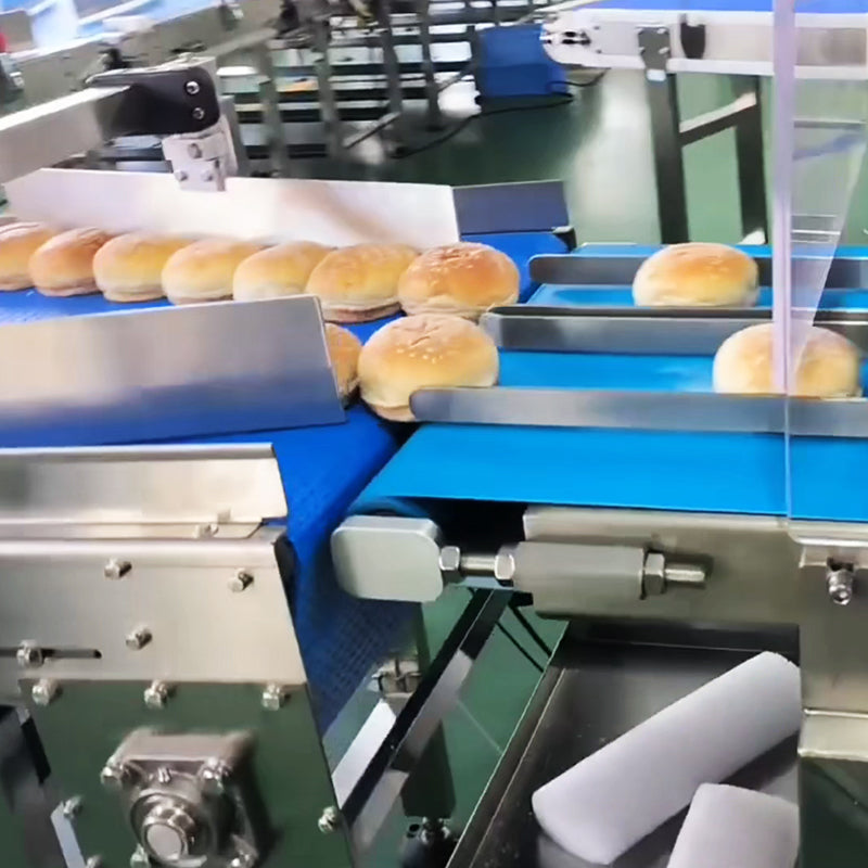 1.The hamburger packing line is composed of a stretch conveyor,a sorting unit and an automatic packing machine,which stretches and evenly sorts round bread and other products.After photoelectric detection,control the sorting unit and the blocking mechanism,arrange and combine according to the set number,enter the automatic packing machine for packing,and achieve the effect of continuous, orderly production,low rejection rate and beautiful packing.
