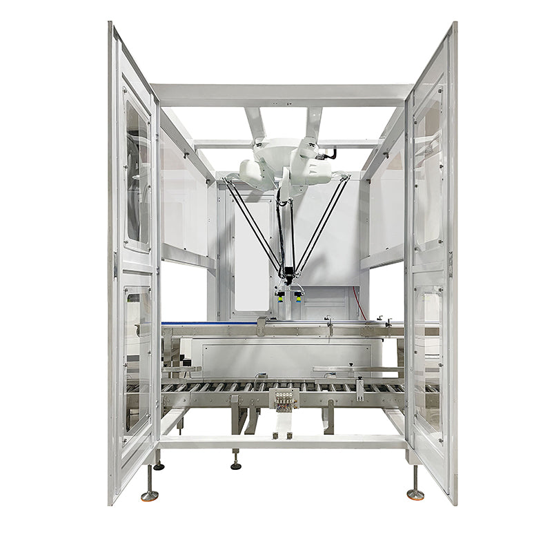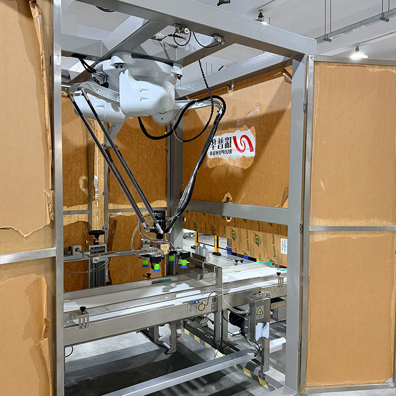 photoelectric system detects the product and sends a signal to the parallel robot to grab it.